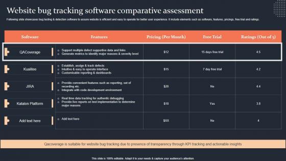 Following slide showcases bug testing and detection software to assure website is efficient and easy to operate for better user experience. It include elements such as software, features, pricings, free trial and ratings. Welcome to our selection of the Complete Guide To Launch Website Bug Tracking Software Comparative Assessment. These are designed to help you showcase your creativity and bring your sphere to life. Planning and Innovation are essential for any business that is just starting out. This collection contains the designs that you need for your everyday presentations. All of our PowerPoints are 100Percent editable, so you can customize them to suit your needs. This multi-purpose template can be used in various situations. Grab these presentation templates today. Following slide showcases bug testing and detection software to assure website is efficient and easy to operate for better user experience. It include elements such as software, features, pricings, free trial and ratings.