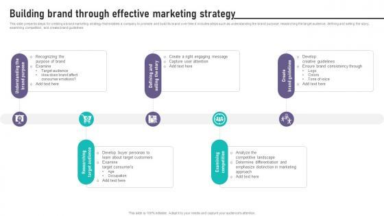 This slide presents steps for creating a brand marketing strategy that enables a company to promote and build its brand over time.it includes steps such as understanding the brand purpose, researching the target audience, defining and selling the story, examining competition, and create brand guidelines. Want to ace your presentation in front of a live audience Our Optimizing Brand Equity Through Strategic Management Building Brand Through Effective Marketing Strategy Structure PDF can help you do that by engaging all the users towards you.. Slidegeeks experts have put their efforts and expertise into creating these impeccable powerpoint presentations so that you can communicate your ideas clearly. Moreover, all the templates are customizable, and easy-to-edit and downloadable. Use these for both personal and commercial use.
