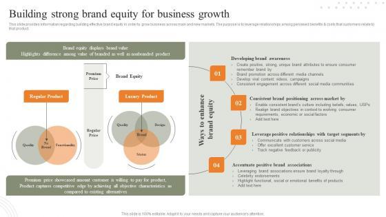 This slide provides information regarding building effective brand equity in order to grow business across main and new markets. The purpose is to leverage relationships among perceived benefits and costs that customers relate to that product. Slidegeeks is one of the best resources for PowerPoint templates. You can download easily and regulate Efficient Administration Of Product Business And Umbrella Branding Building Strong Brand Equity For Business Growth Graphics PDF for your personal presentations from our wonderful collection. A few clicks is all it takes to discover and get the most relevant and appropriate templates. Use our Templates to add a unique zing and appeal to your presentation and meetings. All the slides are easy to edit and you can use them even for advertisement purposes.