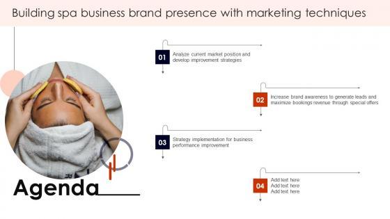 Find a pre designed and impeccable Agenda Building Spa Business Brand Presence With Marketing Techniques Brochure Pdf. The templates can ace your presentation without additional effort. You can download these easy to edit presentation templates to make your presentation stand out from others. So, what are you waiting for Download the template from Slidegeeks today and give a unique touch to your presentation. Our Agenda Building Spa Business Brand Presence With Marketing Techniques Brochure Pdf are topically designed to provide an attractive backdrop to any subject. Use them to look like a presentation pro.