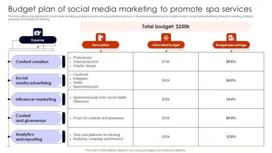 This slide outlines a budget plan for social media marketing campaign to reach and target potential customers. It showcases expenses such as content creation, social media advertising, influencer marketing, contest and giveaways and analytics and reporting. Want to ace your presentation in front of a live audience Our Budget Plan Of Social Media Building Spa Business Brand Presence Marketing Brochure Pdf can help you do that by engaging all the users towards you. Slidegeeks experts have put their efforts and expertise into creating these impeccable powerpoint presentations so that you can communicate your ideas clearly. Moreover, all the templates are customizable, and easy to edit and downloadable. Use these for both personal and commercial use. This slide outlines a budget plan for social media marketing campaign to reach and target potential customers. It showcases expenses such as content creation, social media advertising, influencer marketing, contest and giveaways and analytics and reporting.
