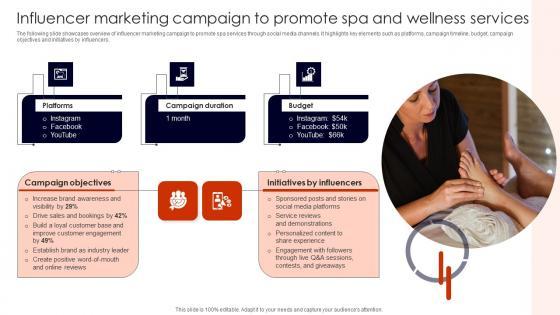 The following slide showcases overview of influencer marketing campaign to promote spa services through social media channels. It highlights key elements such as platforms, campaign timeline, budget, campaign objectives and initiatives by influencers. There are so many reasons you need a Building Spa Business Brand Presence Marketing Influencer Marketing Campaign Graphics Pdf. The first reason is you can not spend time making everything from scratch, Thus, Slidegeeks has made presentation templates for you too. You can easily download these templates from our website easily. The following slide showcases overview of influencer marketing campaign to promote spa services through social media channels. It highlights key elements such as platforms, campaign timeline, budget, campaign objectives and initiatives by influencers.