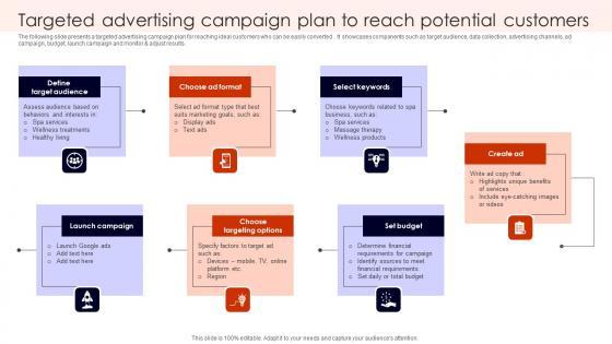 The following slide presents a targeted advertising campaign plan for reaching ideal customers who can be easily converted . It showcases components such as target audience, data collection, advertising channels, ad campaign, budget, launch campaign and monitor and adjust results. Get a simple yet stunning designed Building Spa Business Brand Presence Marketing Targeted Advertising Campaign Portrait Pdf. It is the best one to establish the tone in your meetings. It is an excellent way to make your presentations highly effective. So, download this PPT today from Slidegeeks and see the positive impacts. Our easy to edit Building Spa Business Brand Presence Marketing Targeted Advertising Campaign Portrait Pdf can be your go to option for all upcoming conferences and meetings. So, what are you waiting for Grab this template today. The following slide presents a targeted advertising campaign plan for reaching ideal customers who can be easily converted . It showcases components such as target audience, data collection, advertising channels, ad campaign, budget, launch campaign and monitor and adjust results.