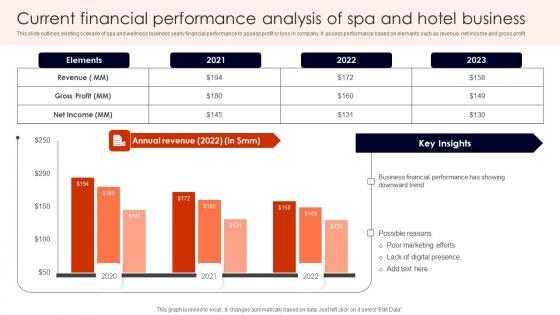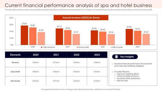 This slide outlines existing scenario of spa and wellness business yearly financial performance to assess profit or loss in company. It assess performance based on elements such as revenue, net income and gross profit. Slidegeeks is here to make your presentations a breeze with Current Financial Performance Building Spa Business Brand Presence Marketeting Icons Pdf With our easy to use and customizable templates, you can focus on delivering your ideas rather than worrying about formatting. With a variety of designs to choose from, you are sure to find one that suits your needs. And with animations and unique photos, illustrations, and fonts, you can make your presentation pop. So whether you are giving a sales pitch or presenting to the board, make sure to check out Slidegeeks first This slide outlines existing scenario of spa and wellness business yearly financial performance to assess profit or loss in company. It assess performance based on elements such as revenue, net income and gross profit.