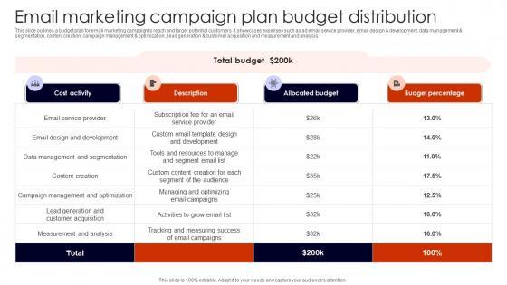 This slide outlines a budget plan for email marketing campaign to reach and target potential customers. It showcases expenses such as ad email service provider, email design and development, data management and segmentation, content creation, campaign management and optimization., lead generation and customer acquisition and measurement and analysis. Whether you have daily or monthly meetings, a brilliant presentation is necessary. Email Marketing Campaign Plan Building Spa Business Brand Presence Marketing Designs Pdf can be your best option for delivering a presentation. Represent everything in detail using Email Marketing Campaign Plan Building Spa Business Brand Presence Marketing Designs Pdf and make yourself stand out in meetings. The template is versatile and follows a structure that will cater to your requirements. All the templates prepared by Slidegeeks are easy to download and edit. Our research experts have taken care of the corporate themes as well. So, give it a try and see the results. This slide outlines a budget plan for email marketing campaign to reach and target potential customers. It showcases expenses such as ad email service provider, email design and development, data management and segmentation, content creation, campaign management and optimization., lead generation and customer acquisition and measurement and analysis.