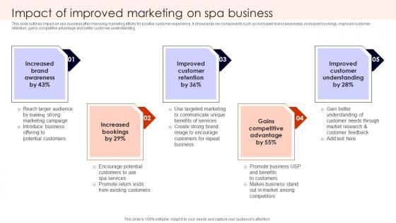 This slide outlines impact on spa business after improving marketing efforts for positive customer experience. It showcases key components such as increased brand awareness, increased bookings, improved customer retention, gains competitive advantage and better customer understanding. If your project calls for a presentation, then Slidegeeks is your go to partner because we have professionally designed, easy to edit templates that are perfect for any presentation. After downloading, you can easily edit Impact Improved Marketing Building Spa Business Brand Presence Marketing Pictures Pdf and make the changes accordingly. You can rearrange slides or fill them with different images. Check out all the handy templates This slide outlines impact on spa business after improving marketing efforts for positive customer experience. It showcases key components such as increased brand awareness, increased bookings, improved customer retention, gains competitive advantage and better customer understanding.