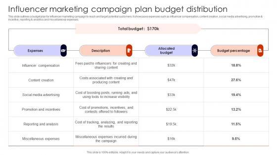 This slide outlines a budget plan for influencer marketing campaign to reach and target potential customers. It showcases expenses such as influencer compensation, content creation, social media advertising, promotion and incentive, reporting and analytics and miscellaneous expenses. Are you in need of a template that can accommodate all of your creative concepts This one is crafted professionally and can be altered to fit any style. Use it with Google Slides or PowerPoint. Include striking photographs, symbols, depictions, and other visuals. Fill, move around, or remove text boxes as desired. Test out color palettes and font mixtures. Edit and save your work, or work with colleagues. Download Influencer Marketing Campaign Building Spa Business Brand Presence Marketing Graphics Pdf and observe how to make your presentation outstanding. Give an impeccable presentation to your group and make your presentation unforgettable. This slide outlines a budget plan for influencer marketing campaign to reach and target potential customers. It showcases expenses such as influencer compensation, content creation, social media advertising, promotion and incentive, reporting and analytics and miscellaneous expenses.