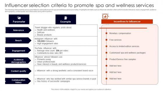 The following slide presents various parameters to select influencers for spa and wellness service promoting. It highlights elements such as influencer selection criteria which includes relevance, reach, engagement, audience demographics, content quality and collaboration along with incentives. Crafting an eye catching presentation has never been more straightforward. Let your presentation shine with this tasteful yet straightforward Influencer Selection Criteria Building Spa Business Brand Presence Marketing Topics Pdf template. It offers a minimalistic and classy look that is great for making a statement. The colors have been employed intelligently to add a bit of playfulness while still remaining professional. Construct the ideal Influencer Selection Criteria Building Spa Business Brand Presence Marketing Topics Pdf that effortlessly grabs the attention of your audience Begin now and be certain to wow your customers The following slide presents various parameters to select influencers for spa and wellness service promoting. It highlights elements such as influencer selection criteria which includes relevance, reach, engagement, audience demographics, content quality and collaboration along with incentives.