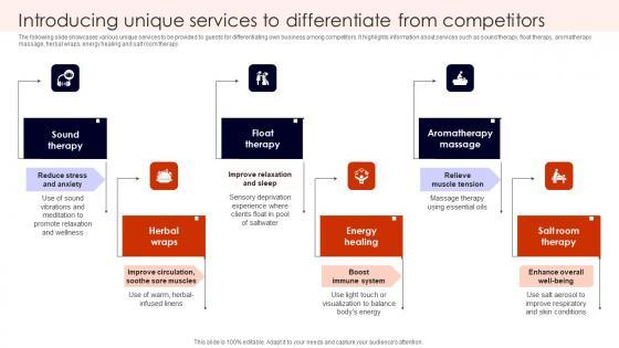 The following slide showcases various unique services to be provided to guests for differentiating own business among competitors. It highlights information about services such as sound therapy, float therapy, aromatherapy massage, herbal wraps, energy healing and salt room therapy. Make sure to capture your audiences attention in your business displays with our gratis customizable Introducing Unique Services Building Spa Business Brand Presence Marketing Inspiration Pdf. These are great for business strategies, office conferences, capital raising or task suggestions. If you desire to acquire more customers for your tech business and ensure they stay satisfied, create your own sales presentation with these plain slides. The following slide showcases various unique services to be provided to guests for differentiating own business among competitors. It highlights information about services such as sound therapy, float therapy, aromatherapy massage, herbal wraps, energy healing and salt room therapy.