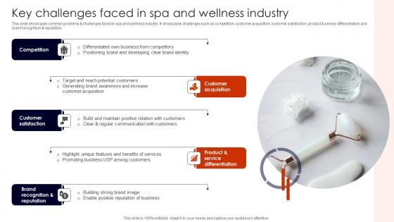 This slide showcases common problems and challenges faced in spa and wellness industry. It showcases challenges such as competition, customer acquisition, customer satisfaction, product and service differentiation and brand recognition and reputation. Formulating a presentation can take up a lot of effort and time, so the content and message should always be the primary focus. The visuals of the PowerPoint can enhance the presenters message, so our Key Challenges Faced In Spa Building Spa Business Brand Presence Marketing Introduction Pdf was created to help save time. Instead of worrying about the design, the presenter can concentrate on the message while our designers work on creating the ideal templates for whatever situation is needed. Slidegeeks has experts for everything from amazing designs to valuable content, we have put everything into Key Challenges Faced In Spa Building Spa Business Brand Presence Marketing Introduction Pdf This slide showcases common problems and challenges faced in spa and wellness industry. It showcases challenges such as competition, customer acquisition, customer satisfaction, product and service differentiation and brand recognition and reputation.