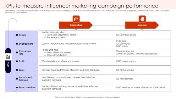 The following slide showcases various metrics to analyze impact of influencer marketing campaign and make data driven decisions. It showcases KPIs such as reach, engagement, conversion rate. Traffic, sales, social media followers and brand mentions. This modern and well arranged KPIs To Measure Influencer Building Spa Business Brand Presence Marketing Demonstration Pdf provides lots of creative possibilities. It is very simple to customize and edit with the Powerpoint Software. Just drag and drop your pictures into the shapes. All facets of this template can be edited with Powerpoint, no extra software is necessary. Add your own material, put your images in the places assigned for them, adjust the colors, and then you can show your slides to the world, with an animated slide included. The following slide showcases various metrics to analyze impact of influencer marketing campaign and make data driven decisions. It showcases KPIs such as reach, engagement, conversion rate. Traffic, sales, social media followers and brand mentions.