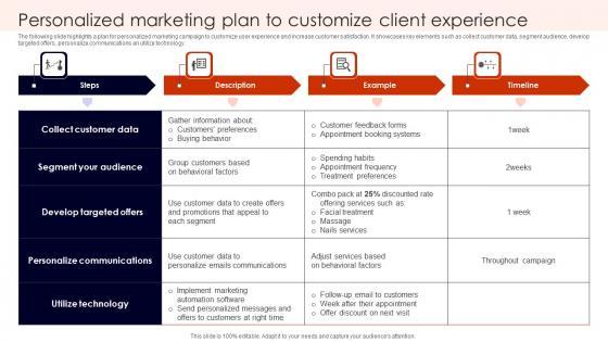 The following slide highlights a plan for personalized marketing campaign to customize user experience and increase customer satisfaction. It showcases key elements such as collect customer data, segment audience, develop targeted offers, personalize communications an utilize technology. Are you searching for a Personalized Marketing Plan Customize Building Spa Business Brand Presence Marketing Slides Pdf that is uncluttered, straightforward, and original Its easy to edit, and you can change the colors to suit your personal or business branding. For a presentation that expresses how much effort you have put in, this template is ideal With all of its features, including tables, diagrams, statistics, and lists, its perfect for a business plan presentation. Make your ideas more appealing with these professional slides. Download Personalized Marketing Plan Customize Building Spa Business Brand Presence Marketing Slides Pdf from Slidegeeks today. The following slide highlights a plan for personalized marketing campaign to customize user experience and increase customer satisfaction. It showcases key elements such as collect customer data, segment audience, develop targeted offers, personalize communications an utilize technology.