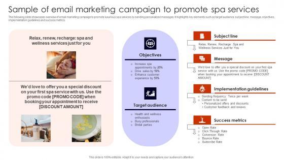 The following slide showcases overview of email marketing campaign to promote luxurious spa services by sending personalized messages. It highlights key elements such as target audience, subject line, message, objectives, implementation guidelines and success metrics. Here you can discover an assortment of the finest PowerPoint and Google Slides templates. With these templates, you can create presentations for a variety of purposes while simultaneously providing your audience with an eye catching visual experience. Download Sample Email Marketing Campaign Building Spa Business Brand Presence Marketing Portrait Pdf to deliver an impeccable presentation. These templates will make your job of preparing presentations much quicker, yet still, maintain a high level of quality. Slidegeeks has experienced researchers who prepare these templates and write high quality content for you. Later on, you can personalize the content by editing the Sample Email Marketing Campaign Building Spa Business Brand Presence Marketing Portrait Pdf. The following slide showcases overview of email marketing campaign to promote luxurious spa services by sending personalized messages. It highlights key elements such as target audience, subject line, message, objectives, implementation guidelines and success metrics.
