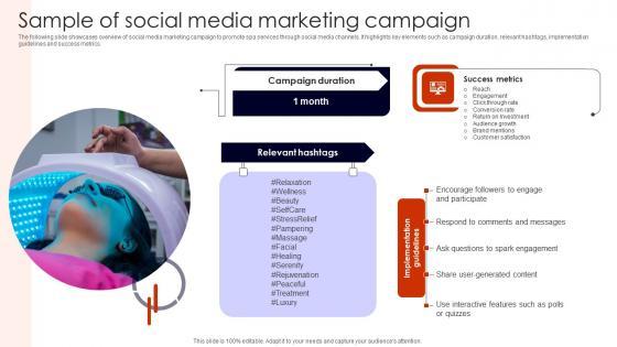 The following slide showcases overview of social media marketing campaign to promote spa services through social media channels. It highlights key elements such as campaign duration, relevant hashtags, implementation guidelines and success metrics. Take your projects to the next level with our ultimate collection of Sample Social Media Marketing Building Spa Business Brand Presence Marketing Pictures Pdf. Slidegeeks has designed a range of layouts that are perfect for representing task or activity duration, keeping track of all your deadlines at a glance. Tailor these designs to your exact needs and give them a truly corporate look with your own brand colors they will make your projects stand out from the rest The following slide showcases overview of social media marketing campaign to promote spa services through social media channels. It highlights key elements such as campaign duration, relevant hashtags, implementation guidelines and success metrics.