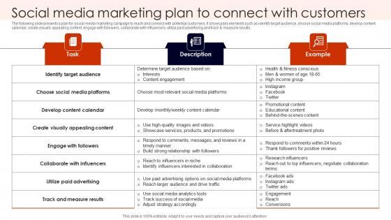 The following slide presents a plan for social media marketing campaign to reach and connect with potential customers. It showcases elements such as identify target audience, choose social media platforms, develop content calendar, create visually appealing content, engage with followers, collaborate with influencers, utilize paid advertising and track and measure results. Boost your pitch with our creative Social Media Marketing Plan Building Spa Business Brand Presence Marketing Graphics Pdf. Deliver an awe inspiring pitch that will mesmerize everyone. Using these presentation templates you will surely catch everyones attention. You can browse the ppts collection on our website. We have researchers who are experts at creating the right content for the templates. So you do not have to invest time in any additional work. Just grab the template now and use them. The following slide presents a plan for social media marketing campaign to reach and connect with potential customers. It showcases elements such as identify target audience, choose social media platforms, develop content calendar, create visually appealing content, engage with followers, collaborate with influencers, utilize paid advertising and track and measure results.