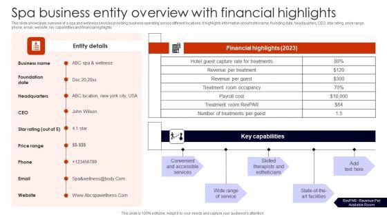 This slide showcases overview of a spa and wellness services providing business operating across different locations. It highlights information about hotel name, founding date, headquarters, CEO, star rating, price range, phone, email, website, key capabilities and financial highlights. Create an editable Spa Business Entity Overview Building Spa Business Brand Presence Marketing Information Pdf that communicates your idea and engages your audience. Whether you are presenting a business or an educational presentation, pre designed presentation templates help save time. Spa Business Entity Overview Building Spa Business Brand Presence Marketing Information Pdf is highly customizable and very easy to edit, covering many different styles from creative to business presentations. Slidegeeks has creative team members who have crafted amazing templates. So, go and get them without any delay. This slide showcases overview of a spa and wellness services providing business operating across different locations. It highlights information about hotel name, founding date, headquarters, CEO, star rating, price range, phone, email, website, key capabilities and financial highlights.