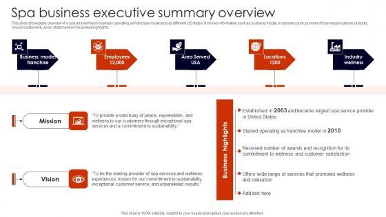 This slide showcases overview of a spa and wellness business operating as franchise model across different US states. It shows information such as business model, employee count, number of business locations, industry, mission statement, vision statement and business highlights. Slidegeeks is one of the best resources for PowerPoint templates. You can download easily and regulate Spa Business Executive Summary Building Spa Business Brand Presence Marketing Icons Pdf for your personal presentations from our wonderful collection. A few clicks is all it takes to discover and get the most relevant and appropriate templates. Use our Templates to add a unique zing and appeal to your presentation and meetings. All the slides are easy to edit and you can use them even for advertisement purposes. This slide showcases overview of a spa and wellness business operating as franchise model across different US states. It shows information such as business model, employee count, number of business locations, industry, mission statement, vision statement and business highlights.