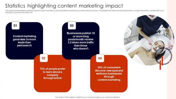 This slide presents statistics showing impact of content marketing on spa and wellness business to promote product or services. It highlights information about lead generation, company information, website traffic, post publication, business information, etc. Want to ace your presentation in front of a live audience Our Statistics Highlighting Content Building Spa Business Brand Presence Marketing Diagrams Pdf can help you do that by engaging all the users towards you. Slidegeeks experts have put their efforts and expertise into creating these impeccable powerpoint presentations so that you can communicate your ideas clearly. Moreover, all the templates are customizable, and easy to edit and downloadable. Use these for both personal and commercial use. This slide presents statistics showing impact of content marketing on spa and wellness business to promote product or services. It highlights information about lead generation, company information, website traffic, post publication, business information, etc.