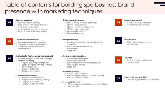 There are so many reasons you need a Table Of Contents For Building Spa Business Brand Presence With Marketing Techniques Pictures Pdf. The first reason is you can not spend time making everything from scratch, Thus, Slidegeeks has made presentation templates for you too. You can easily download these templates from our website easily. Our Table Of Contents For Building Spa Business Brand Presence With Marketing Techniques Pictures Pdf are topically designed to provide an attractive backdrop to any subject. Use them to look like a presentation pro.