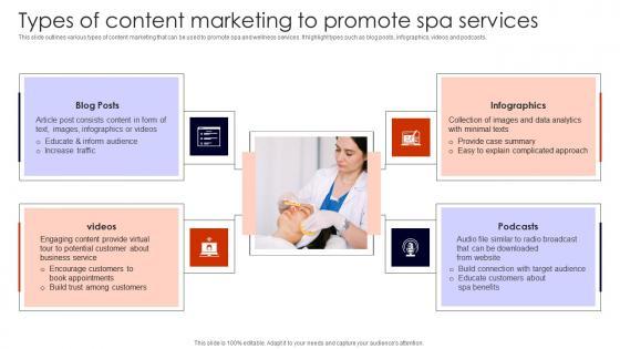 This slide outlines various types of content marketing that can be used to promote spa and wellness services. It highlight types such as blog posts, infographics, videos and podcasts. From laying roadmaps to briefing everything in detail, our templates are perfect for you. You can set the stage with your presentation slides. All you have to do is download these easy to edit and customizable templates. Types Of Content Marketing Promote Building Spa Business Brand Presence Marketing Background Pdf will help you deliver an outstanding performance that everyone would remember and praise you for. Do download this presentation today. This slide outlines various types of content marketing that can be used to promote spa and wellness services. It highlight types such as blog posts, infographics, videos and podcasts.