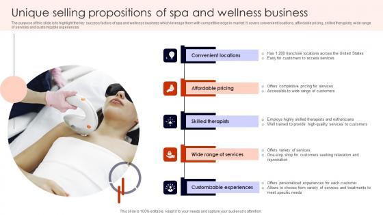 The purpose of this slide is to highlight the key success factors of spa and wellness business which leverage them with competitive edge in market. It covers convenient locations, affordable pricing, skilled therapists, wide range of services and customizable experiences. Get a simple yet stunning designed Unique Selling Propositions Building Spa Business Brand Presence Marketing Information Pdf. It is the best one to establish the tone in your meetings. It is an excellent way to make your presentations highly effective. So, download this PPT today from Slidegeeks and see the positive impacts. Our easy to edit Unique Selling Propositions Building Spa Business Brand Presence Marketing Information Pdf can be your go to option for all upcoming conferences and meetings. So, what are you waiting for Grab this template today. The purpose of this slide is to highlight the key success factors of spa and wellness business which leverage them with competitive edge in market. It covers convenient locations, affordable pricing, skilled therapists, wide range of services and customizable experiences.