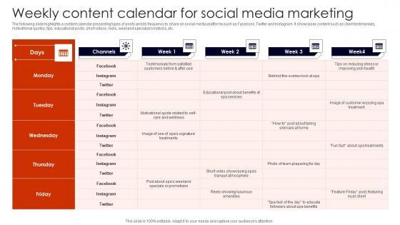 The following slide highlights a content calendar presenting types of posts and its frequency to share on social media platforms such as Facebook, Twitter and Instagram. It showcases content such as client testimonials, motivational quotes, tips, educational posts, short videos, reels, weekend special promotions, etc. From laying roadmaps to briefing everything in detail, our templates are perfect for you. You can set the stage with your presentation slides. All you have to do is download these easy to edit and customizable templates. Weekly Content Calendar Social Building Spa Business Brand Presence Marketing Professional Pdf will help you deliver an outstanding performance that everyone would remember and praise you for. Do download this presentation today. The following slide highlights a content calendar presenting types of posts and its frequency to share on social media platforms such as Facebook, Twitter and Instagram. It showcases content such as client testimonials, motivational quotes, tips, educational posts, short videos, reels, weekend special promotions, etc.
