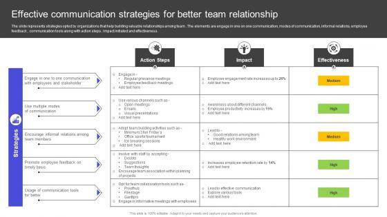 The slide represents strategies opted by organizations that help building valuable relationships among team . The elements are engage in one on one communication, modes of communication, informal relations, employee feedback , communication tools along with action steps , impact initiated and effectiveness. Slidegeeks is one of the best resources for PowerPoint templates. You can download easily and regulate Strategies To Build Meaningful Effective Communication Strategies For Better Team Information Pdf for your personal presentations from our wonderful collection. A few clicks is all it takes to discover and get the most relevant and appropriate templates. Use our Templates to add a unique zing and appeal to your presentation and meetings. All the slides are easy to edit and you can use them even for advertisement purposes. The slide represents strategies opted by organizations that help building valuable relationships among team . The elements are engage in one on one communication, modes of communication, informal relations, employee feedback , communication tools along with action steps , impact initiated and effectiveness.