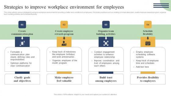This slide outlines various strategies to enhance workplace environment for providing a better work conditions to employees. It includes practices such as creating communication plan, create employee rewards program, organize team building activities and schedule flexibility. Take your projects to the next level with our ultimate collection of Action Measures To Build Staff Strategies To Improve Workplace Environment Clipart Pdf. Slidegeeks has designed a range of layouts that are perfect for representing task or activity duration, keeping track of all your deadlines at a glance. Tailor these designs to your exact needs and give them a truly corporate look with your own brand colors they well make your projects stand out from the rest. This slide outlines various strategies to enhance workplace environment for providing a better work conditions to employees. It includes practices such as creating communication plan, create employee rewards program, organize team building activities and schedule flexibility.