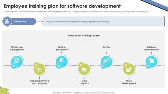 This slide represents a software development training program overview highlighting details such as objective of program and training courses mobile app development, web programming and designing, etc. Do you have an important presentation coming up Are you looking for something that will make your presentation stand out from the rest Look no further than Employee Training Plan For Software Skill Building Plan For Application PPT Sample DTE SS V. With our professional designs, you can trust that your presentation will pop and make delivering it a smooth process. And with Slidegeeks, you can trust that your presentation will be unique and memorable. So why wait Grab Employee Training Plan For Software Skill Building Plan For Application PPT Sample DTE SS V today and make your presentation stand out from the rest This slide represents a software development training program overview highlighting details such as objective of program and training courses mobile app development, web programming and designing, etc.
