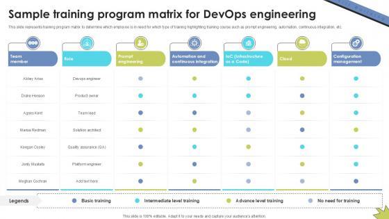 This slide represents training program matrix to determine which employee is in need for which type of training highlighting training course such as prompt engineering, automation, continuous integration, etc. Welcome to our selection of the Sample Training Program Matrix Skill Building Plan For Application PPT Sample DTE SS V. These are designed to help you showcase your creativity and bring your sphere to life. Planning and Innovation are essential for any business that is just starting out. This collection contains the designs that you need for your everyday presentations. All of our PowerPoints are 100Percent editable, so you can customize them to suit your needs. This multi-purpose template can be used in various situations. Grab these presentation templates today. This slide represents training program matrix to determine which employee is in need for which type of training highlighting training course such as prompt engineering, automation, continuous integration, etc.