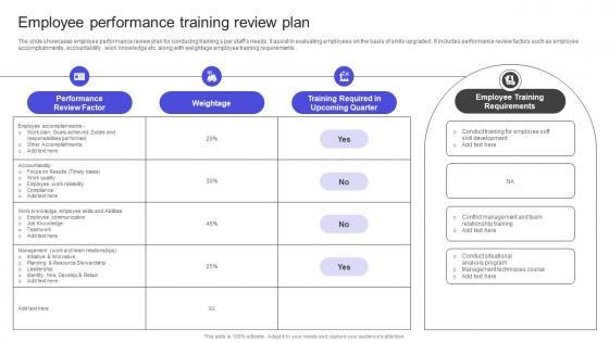 The slide showcases employee performance review plan for conducing training s per staffs needs, it assist in evaluating employees on the basis of skills upgraded . It includes performance review factors such as employee accomplishments, accountability , work knowledge etc. along with weightage employee training requirements . Slidegeeks is here to make your presentations a breeze with Strategies To Build Meaningful Employee Performance Training Review Plan Portrait PDF With our easy-to-use and customizable templates, you can focus on delivering your ideas rather than worrying about formatting. With a variety of designs to choose from, you are sure to find one that suits your needs. And with animations and unique photos, illustrations, and fonts, you can make your presentation pop. So whether you are giving a sales pitch or presenting to the board, make sure to check out Slidegeeks first The slide showcases employee performance review plan for conducing training s per staffs needs, it assist in evaluating employees on the basis of skills upgraded . It includes performance review factors such as employee accomplishments, accountability , work knowledge etc. along with weightage employee training requirements .