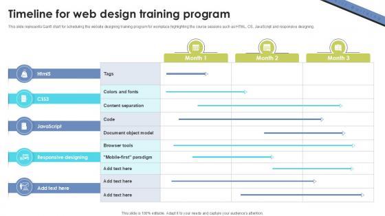 This slide represents Gantt chart for scheduling the website designing training program for workplace highlighting the course sessions such as HTML, CS, JavaScript and responsive designing. Retrieve professionally designed Timeline For Web Design Training Skill Building Plan For Application PPT Presentation DTE SS V to effectively convey your message and captivate your listeners. Save time by selecting pre-made slideshows that are appropriate for various topics, from business to educational purposes. These themes come in many different styles, from creative to corporate, and all of them are easily adjustable and can be edited quickly. Access them as PowerPoint templates or as Google Slides themes. You do not have to go on a hunt for the perfect presentation because Slidegeeks got you covered from everywhere. This slide represents Gantt chart for scheduling the website designing training program for workplace highlighting the course sessions such as HTML, CS, JavaScript and responsive designing.