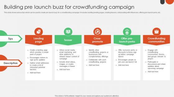 This slide shows various tips which can be used to create pre launch buzz for a crowdfunding campaign. It includes building landing pages, creating teasers, collaborating with influencers, offering pre-launch perks, etc. Create an editable Building Pre Launch Buzz For Crowdfunding For Nonprofits To Support Fin SS V that communicates your idea and engages your audience. Whether you are presenting a business or an educational presentation, pre-designed presentation templates help save time. Building Pre Launch Buzz For Crowdfunding For Nonprofits To Support Fin SS V is highly customizable and very easy to edit, covering many different styles from creative to business presentations. Slidegeeks has creative team members who have crafted amazing templates. So, go and get them without any delay. This slide shows various tips which can be used to create pre launch buzz for a crowdfunding campaign. It includes building landing pages, creating teasers, collaborating with influencers, offering pre-launch perks, etc.