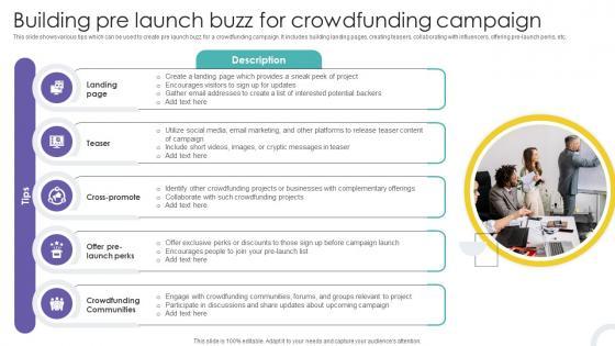 This slide shows various tips which can be used to create pre launch buzz for a crowdfunding campaign. It includes building landing pages, creating teasers, collaborating with influencers, offering pre-launch perks, etc. Create an editable Building Pre Launch Buzz For Crowdfunding Strategies To Raise Funds Fin SS V that communicates your idea and engages your audience. Whether you are presenting a business or an educational presentation, pre-designed presentation templates help save time. Building Pre Launch Buzz For Crowdfunding Strategies To Raise Funds Fin SS V is highly customizable and very easy to edit, covering many different styles from creative to business presentations. Slidegeeks has creative team members who have crafted amazing templates. So, go and get them without any delay. This slide shows various tips which can be used to create pre launch buzz for a crowdfunding campaign. It includes building landing pages, creating teasers, collaborating with influencers, offering pre-launch perks, etc.
