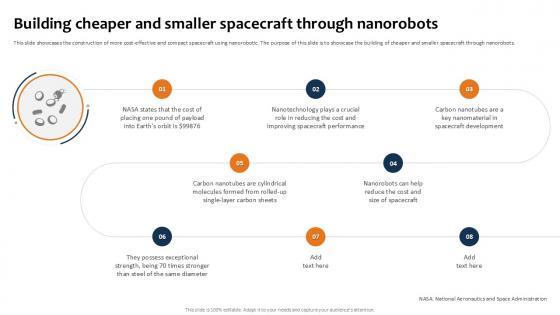 This slide showcases the construction of more cost-effective and compact spacecraft using nanorobotic. The purpose of this slide is to showcase the building of cheaper and smaller spacecraft through nanorobots. Boost your pitch with our creative Building Cheaper And Smaller Exploring Nanorobotics In Space PPT Slides. Deliver an awe-inspiring pitch that will mesmerize everyone. Using these presentation templates you will surely catch everyones attention. You can browse the ppts collection on our website. We have researchers who are experts at creating the right content for the templates. So you do not have to invest time in any additional work. Just grab the template now and use them. This slide showcases the construction of more cost-effective and compact spacecraft using nanorobotic. The purpose of this slide is to showcase the building of cheaper and smaller spacecraft through nanorobots.