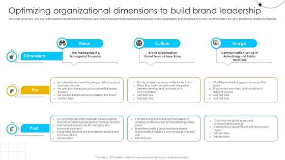 This slide covers pre- and post-optimization organizational dimensions, such as top management and managerial processes, brand organization, brand teams and new roles, communication set-up in advertising, and public relations. Are you searching for a Brand Influence Optimizing Organizational Dimensions To Build Brand Leadership Strategy SS V that is uncluttered, straightforward, and original Its easy to edit, and you can change the colors to suit your personal or business branding. For a presentation that expresses how much effort you have put in, this template is ideal With all of its features, including tables, diagrams, statistics, and lists, its perfect for a business plan presentation. Make your ideas more appealing with these professional slides. Download Brand Influence Optimizing Organizational Dimensions To Build Brand Leadership Strategy SS V from Slidegeeks today. This slide covers pre- and post-optimization organizational dimensions, such as top management and managerial processes, brand organization, brand teams and new roles, communication set-up in advertising, and public relations.