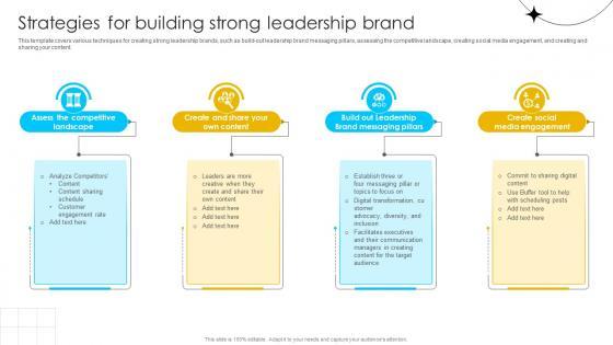 This template covers various techniques for creating strong leadership brands, such as build-out leadership brand messaging pillars, assessing the competitive landscape, creating social media engagement, and creating and sharing your content. Presenting this PowerPoint presentation, titled Brand Influence Strategies For Building Strong Leadership Brand Strategy SS V, with topics curated by our researchers after extensive research. This editable presentation is available for immediate download and provides attractive features when used. Download now and captivate your audience. Presenting this Brand Influence Strategies For Building Strong Leadership Brand Strategy SS V. Our researchers have carefully researched and created these slides with all aspects taken into consideration. This is a completely customizable Brand Influence Strategies For Building Strong Leadership Brand Strategy SS V that is available for immediate downloading. Download now and make an impact on your audience. Highlight the attractive features available with our PPTs. This template covers various techniques for creating strong leadership brands, such as build-out leadership brand messaging pillars, assessing the competitive landscape, creating social media engagement, and creating and sharing your content.