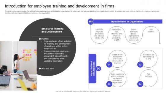 The slide showcases overview of employee training and development initiated in organizations for betterment of employee upskilling and organizations growth . It contains elements such as overview of employee training and development and impact initiated on employees and organization. This modern and well-arranged Strategies To Build Meaningful Introduction For Employee Training And Development In Firms Download PDF provides lots of creative possibilities. It is very simple to customize and edit with the Powerpoint Software. Just drag and drop your pictures into the shapes. All facets of this template can be edited with Powerpoint, no extra software is necessary. Add your own material, put your images in the places assigned for them, adjust the colors, and then you can show your slides to the world, with an animated slide included. The slide showcases overview of employee training and development initiated in organizations for betterment of employee upskilling and organizations growth . It contains elements such as overview of employee training and development and impact initiated on employees and organization.