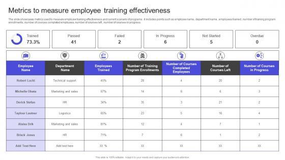 The slide showcases metrics used to measure employee training effectiveness and current scenario of programs . it includes points such as employee name , department name , employees trained , number of training program enrollments , number of courses completed employees, number of courses left , number of courses in progress. Explore a selection of the finest Strategies To Build Meaningful Metrics To Measure Employee Training Effectiveness Sample PDF here. With a plethora of professionally designed and pre-made slide templates, you can quickly and easily find the right one for your upcoming presentation. You can use our Strategies To Build Meaningful Metrics To Measure Employee Training Effectiveness Sample PDF to effectively convey your message to a wider audience. Slidegeeks has done a lot of research before preparing these presentation templates. The content can be personalized and the slides are highly editable. Grab templates today from Slidegeeks. The slide showcases metrics used to measure employee training effectiveness and current scenario of programs . it includes points such as employee name , department name , employees trained , number of training program enrollments , number of courses completed employees, number of courses left , number of courses in progress.