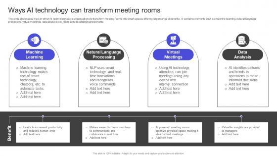The slide showcases ways in which AI technology assist organizations to transform meeting rooms into smart spaces offering larger range of benefits . It contains elements such as machine learning, natural language processing, virtual meetings, data analysis etc. Along with description and benefits. Do you have an important presentation coming up Are you looking for something that will make your presentation stand out from the rest Look no further than Strategies To Build Meaningful Ways Ai Technology Can Transform Meeting Rooms Summary PDF With our professional designs, you can trust that your presentation will pop and make delivering it a smooth process. And with Slidegeeks, you can trust that your presentation will be unique and memorable. So why wait Grab Strategies To Build Meaningful Ways Ai Technology Can Transform Meeting Rooms Summary PDF today and make your presentation stand out from the rest The slide showcases ways in which AI technology assist organizations to transform meeting rooms into smart spaces offering larger range of benefits . It contains elements such as machine learning, natural language processing, virtual meetings, data analysis etc. Along with description and benefits.