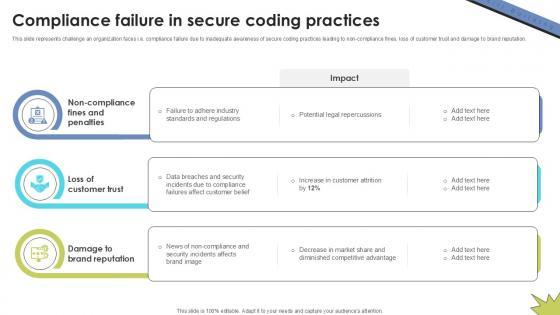 This slide represents challenge an organization faces i.e. compliance failure due to inadequate awareness of secure coding practices leading to non-compliance fines, loss of customer trust and damage to brand reputation. Want to ace your presentation in front of a live audience Our Compliance Failure In Secure Skill Building Plan For Application PPT Slide DTE SS V can help you do that by engaging all the users towards you. Slidegeeks experts have put their efforts and expertise into creating these impeccable powerpoint presentations so that you can communicate your ideas clearly. Moreover, all the templates are customizable, and easy-to-edit and downloadable. Use these for both personal and commercial use. This slide represents challenge an organization faces i.e. compliance failure due to inadequate awareness of secure coding practices leading to non-compliance fines, loss of customer trust and damage to brand reputation.