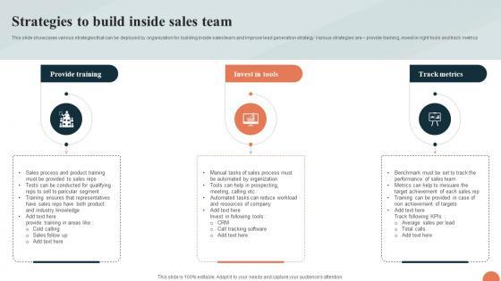 This slide showcases various strategies that can be deployed by organization for building inside sales team and improve lead generation strategy. Various strategies are provide training, invest in right tools and track metrics. Find a pre-designed and impeccable Telesales Strategy For Targeting Strategies To Build Inside Sales Team Strategy SS V. The templates can ace your presentation without additional effort. You can download these easy-to-edit presentation templates to make your presentation stand out from others. So, what are you waiting for Download the template from Slidegeeks today and give a unique touch to your presentation. This slide showcases various strategies that can be deployed by organization for building inside sales team and improve lead generation strategy. Various strategies are provide training, invest in right tools and track metrics.