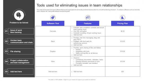 The slide showcases tools and software that assist organization to eliminate problems faced by them in smooth functioning of a team . It contains software such as clockodo, slack, dropbox etc. along with features and pricing plan . Get a simple yet stunning designed Strategies To Build Meaningful Tools Used For Eliminating Issues In Team Relationships Introduction PDF It is the best one to establish the tone in your meetings. It is an excellent way to make your presentations highly effective. So, download this PPT today from Slidegeeks and see the positive impacts. Our easy-to-edit Strategies To Build Meaningful Tools Used For Eliminating Issues In Team Relationships Introduction PDF can be your go-to option for all upcoming conferences and meetings. So, what are you waiting for Grab this template today. The slide showcases tools and software that assist organization to eliminate problems faced by them in smooth functioning of a team . It contains software such as clockodo, slack, dropbox etc. along with features and pricing plan .