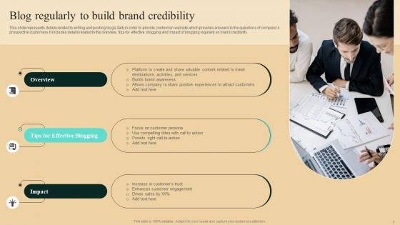 This slide represents details related to writing and posting blogs daily in order to provide content on website which provides answers to the questions of companys prospective customers. It includes details related to the overview, tips for effective blogging and impact of blogging regularly on brand credibility. Get a simple yet stunning designed Guide To Winning Tourism Blog Regularly To Build Brand Credibility Download Pdf It is the best one to establish the tone in your meetings. It is an excellent way to make your presentations highly effective. So, download this PPT today from Slidegeeks and see the positive impacts. Our easy-to-edit Guide To Winning Tourism Blog Regularly To Build Brand Credibility Download Pdf can be your go-to option for all upcoming conferences and meetings. So, what are you waiting for Grab this template today. This slide represents details related to writing and posting blogs daily in order to provide content on website which provides answers to the questions of companys prospective customers. It includes details related to the overview, tips for effective blogging and impact of blogging regularly on brand credibility.
