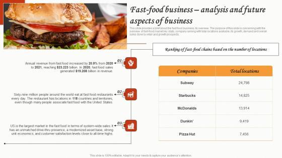This slide provides a brief about the fast food business, its overview. The purpose of this slide is concerning with the overview of fast-food market key stats, company ranking with total locations available, its growth, demand and overall sales done by retail and growth prospects. Are you searching for a Fast Food Business Analysis And Future Aspects Of Business Small Restaurant Business Diagrams Pdf that is uncluttered, straightforward, and original It is easy to edit, and you can change the colors to suit your personal or business branding. For a presentation that expresses how much effort you have put in, this template is ideal With all of its features, including tables, diagrams, statistics, and lists, it is perfect for a business plan presentation. Make your ideas more appealing with these professional slides. Download Fast Food Business Analysis And Future Aspects Of Business Small Restaurant Business Diagrams Pdf from Slidegeeks today. This slide provides a brief about the fast food business, its overview. The purpose of this slide is concerning with the overview of fast-food market key stats, company ranking with total locations available, its growth, demand and overall sales done by retail and growth prospects.