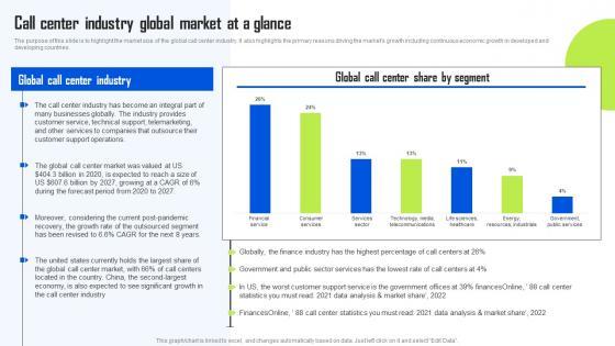 The purpose of this slide is to highlight the market size of the global call center industry. It also highlights the primary reasons driving the markets growth including continuous economic growth in developed and developing countries. From laying roadmaps to briefing everything in detail, our templates are perfect for you. You can set the stage with your presentation slides. All you have to do is download these easy-to-edit and customizable templates. Call Center Industry Global Market At A Glance BPO Center Business Plan Guidelines Pdf will help you deliver an outstanding performance that everyone would remember and praise you for. Do download this presentation today. The purpose of this slide is to highlight the market size of the global call center industry. It also highlights the primary reasons driving the markets growth including continuous economic growth in developed and developing countries.
