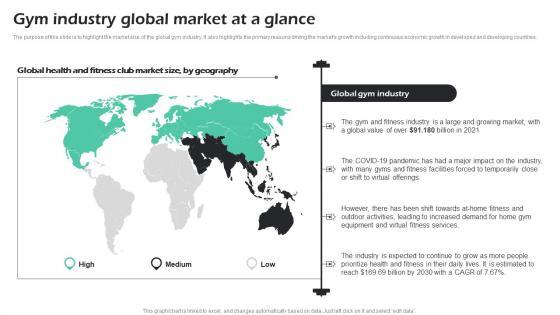 The purpose of this slide is to highlight the market size of the global gym industry. It also highlights the primary reasons driving the markets growth including continuous economic growth in developed and developing countries. Welcome to our selection of the Gym Industry Global Market At A Glance Fitness Center Business Plan Guidelines Pdf These are designed to help you showcase your creativity and bring your sphere to life. Planning and Innovation are essential for any business that is just starting out. This collection contains the designs that you need for your everyday presentations. All of our PowerPoints are 100 percent editable, so you can customize them to suit your needs. This multi-purpose template can be used in various situations. Grab these presentation templates today. The purpose of this slide is to highlight the market size of the global gym industry. It also highlights the primary reasons driving the markets growth including continuous economic growth in developed and developing countries.