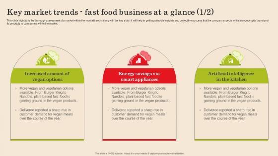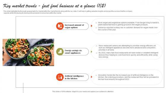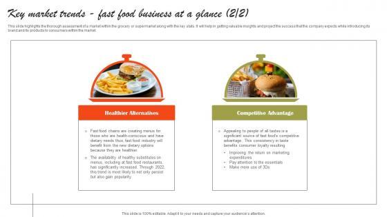 This slide highlights the thorough assessment of a market within the market trends along with the key stats. It will help in getting valuable insights and project the success that the company expects while introducing its brand and its products to consumers within the market. Are you searching for a Key Market Trends Fast Food Business At A Glance Fast Food Business Plan Ideas Pdf that is uncluttered, straightforward, and original Its easy to edit, and you can change the colors to suit your personal or business branding. For a presentation that expresses how much effort you have put in, this template is ideal With all of its features, including tables, diagrams, statistics, and lists, its perfect for a business plan presentation. Make your ideas more appealing with these professional slides. Download Key Market Trends Fast Food Business At A Glance Fast Food Business Plan Ideas Pdf from Slidegeeks today. This slide highlights the thorough assessment of a market within the market trends along with the key stats. It will help in getting valuable insights and project the success that the company expects while introducing its brand and its products to consumers within the market.