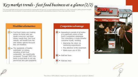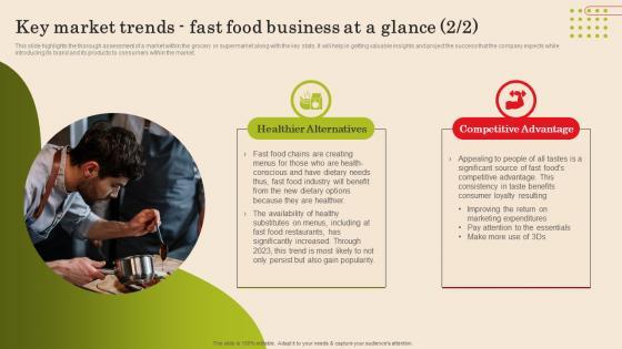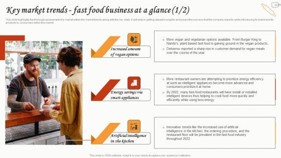 This slide highlights the thorough assessment of a market within the market trends along with the key stats. It will help in getting valuable insights and project the success that the company expects while introducing its brand and its products to consumers within the market.The best PPT templates are a great way to save time, energy, and resources. Slidegeeks have 100Precent editable powerpoint slides making them incredibly versatile. With these quality presentation templates, you can create a captivating and memorable presentation by combining visually appealing slides and effectively communicating your message. Download Key Market Trends Fast Food Business At A Glance Small Fast Food Business Plan Inspiration Pdf from Slidegeeks and deliver a wonderful presentation. This slide highlights the thorough assessment of a market within the market trends along with the key stats. It will help in getting valuable insights and project the success that the company expects while introducing its brand and its products to consumers within the market.
