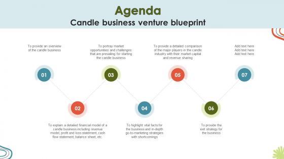 Boost your pitch with our creative Agenda Candle Business Venture Blueprint BP SS V. Deliver an awe-inspiring pitch that will mesmerize everyone. Using these presentation templates you will surely catch everyones attention. You can browse the ppts collection on our website. We have researchers who are experts at creating the right content for the templates. So you do not have to invest time in any additional work. Just grab the template now and use them. Our Agenda Candle Business Venture Blueprint BP SS V are topically designed to provide an attractive backdrop to any subject. Use them to look like a presentation pro.